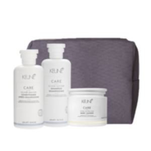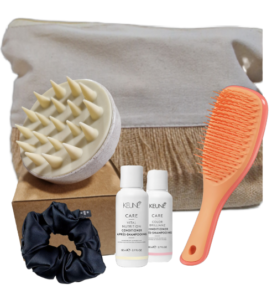 Un coffret élégant incluant une mini brosse Tangle Teaser, un chouchou en soie, des soins Keune en format mini, une trousse en coton avec frange et un bon de 100 CHF valable 1 an sur les prestations Hair Lab.