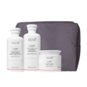 Ensemble de soins pour cheveux colorés, incluant shampooing, après-shampooing, masque, et trousse de toilette.
