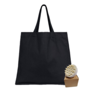 Long sac shopping noir en coton bio (22l) et brosse massante en paille de blé.